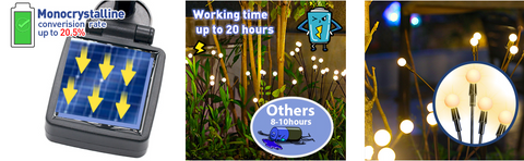 • 【SWAYING WHEN WIND BLOWS,IMITATE REAL FIREFLY】The most unique solar decorative lights in the market, our solar swaying light is propped by very soft & flexible wires, so the light sways when the wind blows, exactly like a cluster of firefly flying in the dark