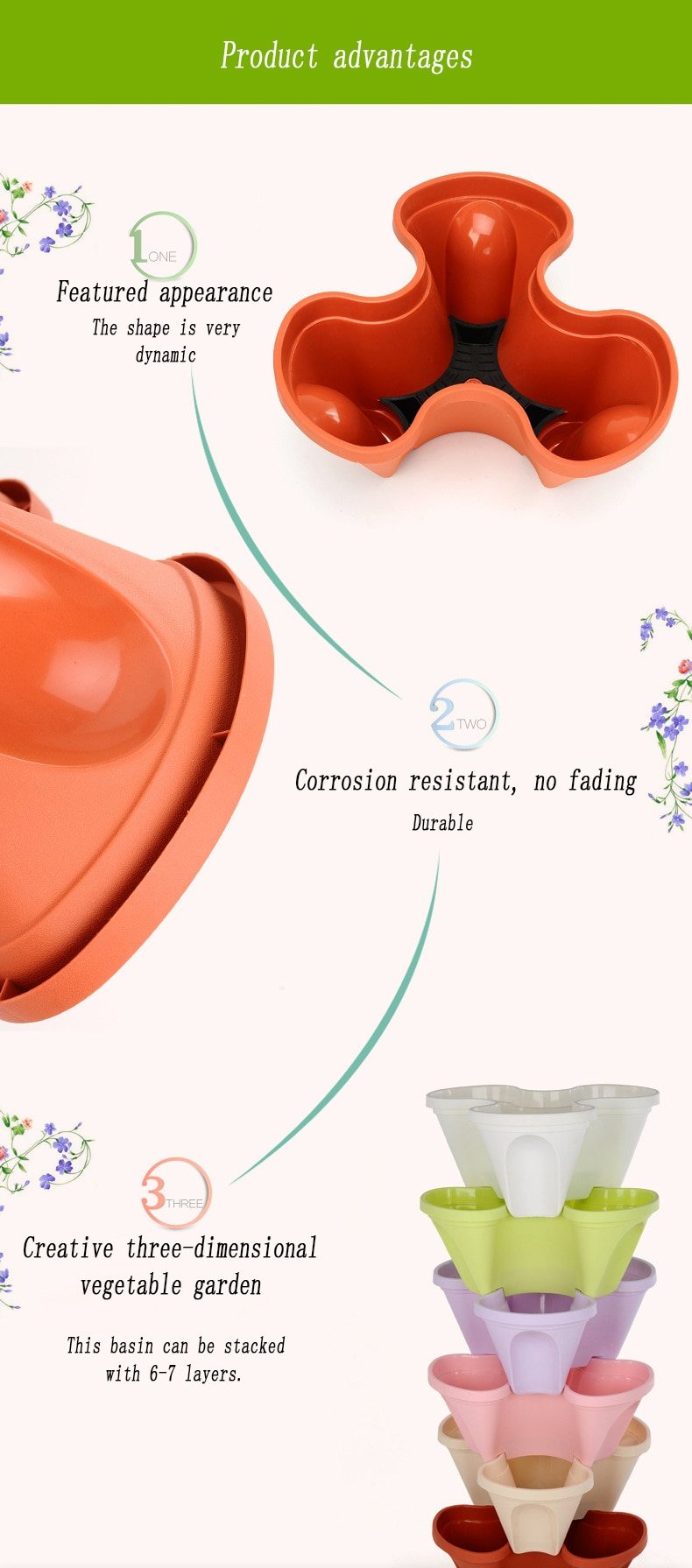 - Flow-through design – Prevents watering or root rot – Water only 1 top pot and care for 20 plants